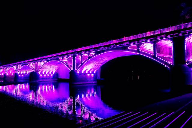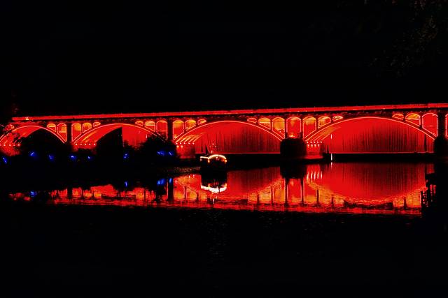 白天的兰汤桥古朴庄重,夜晚的兰汤桥绚丽多彩。