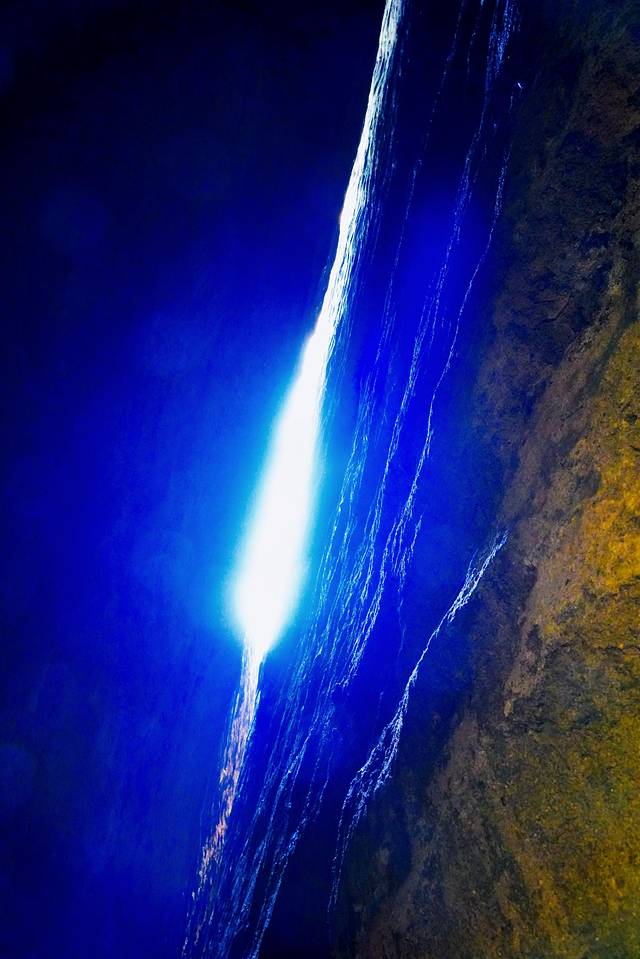 从伏羲洞入岩内,到了深处,抬头仰望,岩顶的罅隙,就像是利斧劈开一样,相去不满一尺,从中漏进天光一线,宛如跨空碧虹,令人叹为观止。