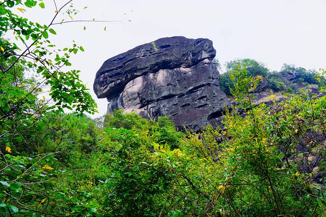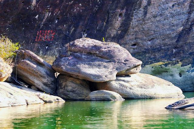 九曲溪两岸的峰岩还具有“移舟换景”的特点,同一山峰处在不同曲水的视点下,往往变幻为不同的景观,峰名也因之而异,形成这个景区最大的特色。底下这块岩石从这个角度看像一只缩头乌龟。