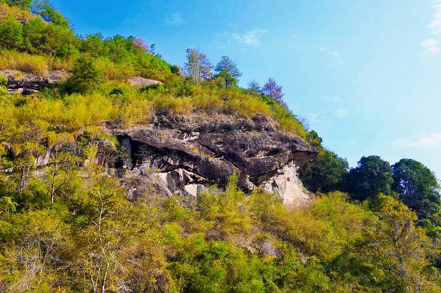 三块削岩最矮的那块石壁突出,中间那块峰顶古木苍翠,而最高的那块刚好面向大王峰,当地人戏称为:三妹大肚子,二姐爱插花,三妹爱大王。