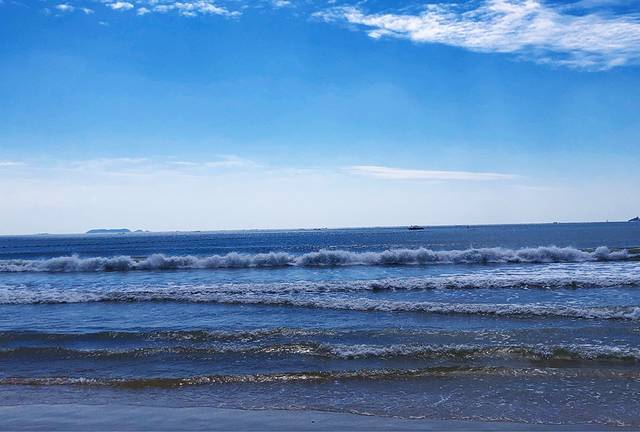 这不是我第一次看到大海,但它与我记忆中萧瑟的海不大相同,湛蓝的海水卷起滚滚的浪花,远看像一条玉带。走进让脚感受海水一次又一次轻缓而不失力量的拍打,海天一色在此时体现的淋漓尽致。