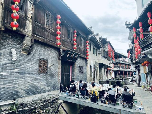 相较于南方动辄非常精致的拱形桥,这里的桥梁就显得原始多了。远远看过去,那不就是一个个的木板嘛。作为一个十分恐水的人,走在这样的桥上,心都胆战心惊的。于是,就这样,我们走过了一个又一个桥梁。甚至还有店家直接在桥上画起了画来,感觉很有意思啊。