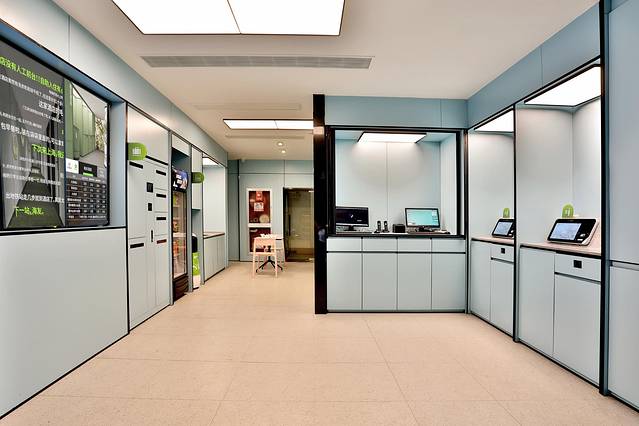 酒店公区请看下图,公区集合了自助登记无接触疫情期间非常便利。自助行李寄存柜、保温柜、冷藏冰箱、自助洗衣机和烘干机。