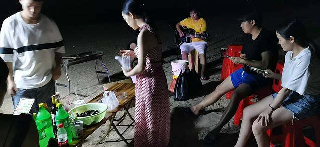 7,9、晚上,我们在民宿海边烧烤,一边烧烤一边吃一边吹着海风聊着天有说有笑,还能听着海浪拍打礁石的声音,那晚月亮还特别亮,那画面特别美,我深深的沉迷在那个的画面。