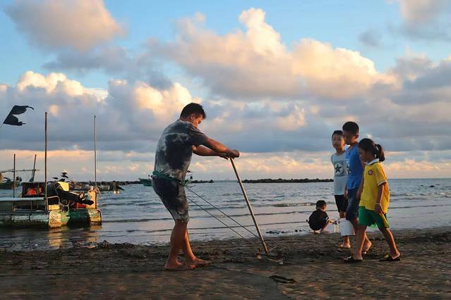游玩2之浅海撒完捕鱼~房东提供渔网以及技术指导,当然也是要看潮水的,这个好玩,拿着渔网放一个U型,然后再附近戏水,反正是制造各种声音吓那些鱼儿往我们的陷阱(渔网)里跑。