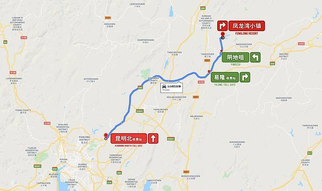 自驾昆明出发,G56杭瑞高速到达易隆收费站后,根据路标指示沿320国道前行至阴地咀,沿路标指示转入易白公路 ,继续行驶约 5km 即可到达凤龙湾小镇 。进入易白公路后注意留意路边导视牌,不然很容易错过了。