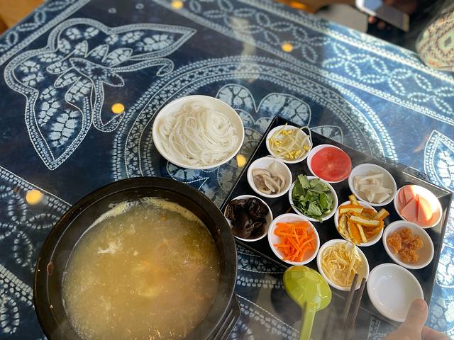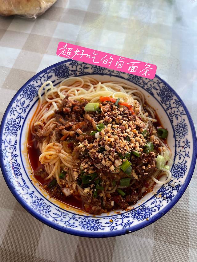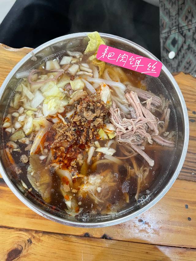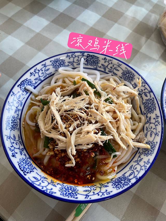 一家清真的早餐店,我看很多当地人都在那里打包,有凉鸡米线、煮米线,卤面条,还有其它的,我们点了凉鸡米线和卤面条。那个卤面条好好吃,有点类似成都的素椒杂酱,但是内容还要丰富点,对于比较挑剔的老公来说,说是这次旅行最好吃的食物,因为第二天早上又来打卡了,哈哈。名字我居然忘了拍,就在出农贸市场后往南边方向右手边的路左边。