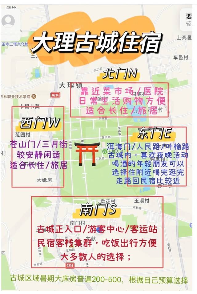 南门:古城四门之首,建于1382年,为古城最古老雄伟的建筑,是大理古城的象征和标志,古城正入口、游客中心、吃饭出行方便,人也最多。五华楼、洋人街、文庙都离得比较近。