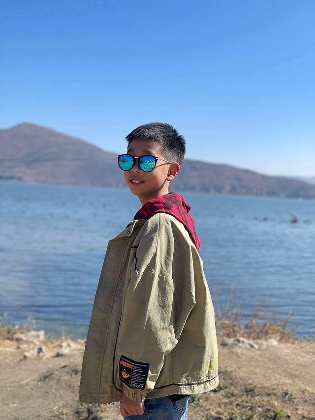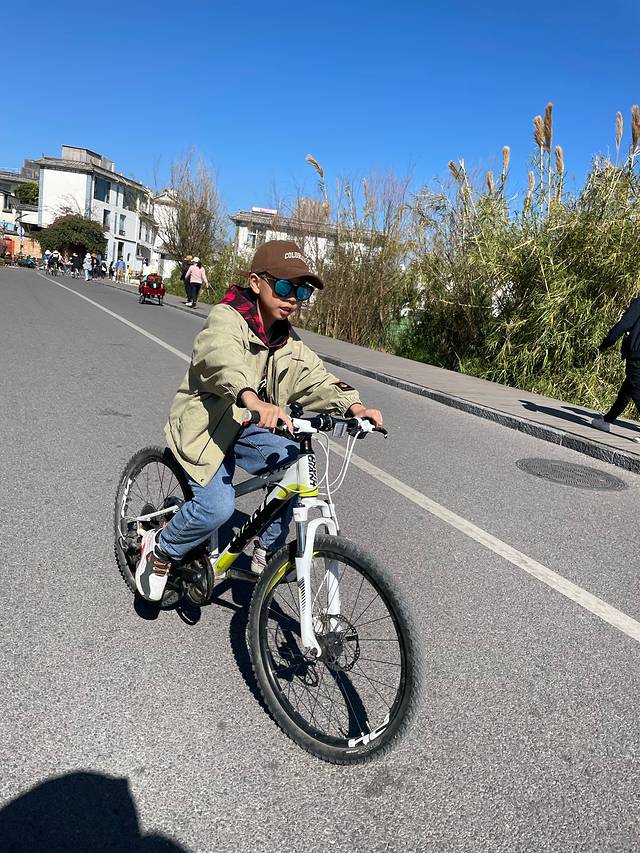 吃完饭,都快10点过了,我们打了个滴滴到了才村码头,好多租自行车的,给给儿子挑选了一辆赛车,是村民爷爷自家孙子到昆明读书留下的,车型不错,骑着停顺滑的的。本来想一人一辆,结果孩子爸说,如此美丽的风景,要让我感受下坐在他自行车后座上骑行的浪漫,说买不起宝马也要感受浪漫,我也是醉了。我这个120斤的体重,我就让他感受下巴,哈哈。还给儿子安排了一个任务,一定要给我们拍个载着我们的视频。