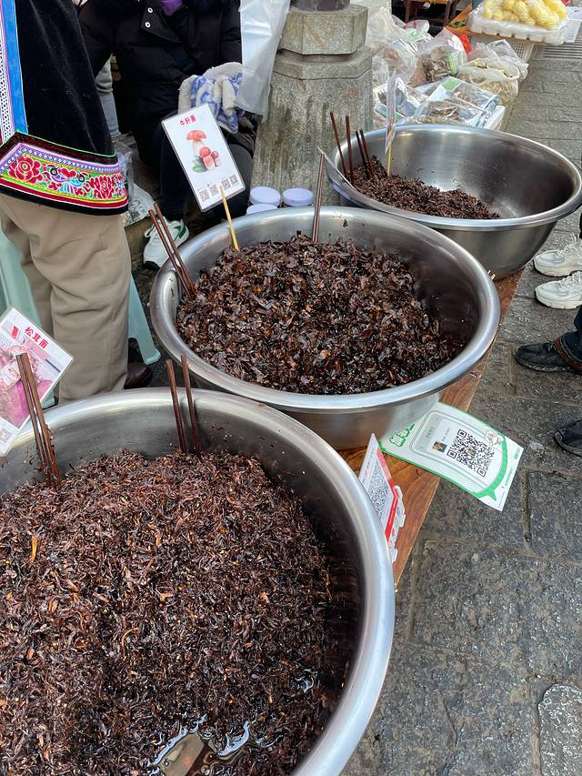 累了,晒了,大风也吹了,照也拍了,肚子也饿了,开始吃饭吧。才村到东门近,打车10分钟不到就到了。想着东门的美食挺多,我们就打算吃吃喝喝,逛逛繁华的人民路,穿古城回客栈。先找了家野生菌汤锅试试,可能没找对吧,我们都感觉一般。