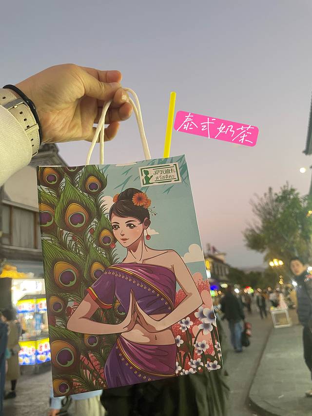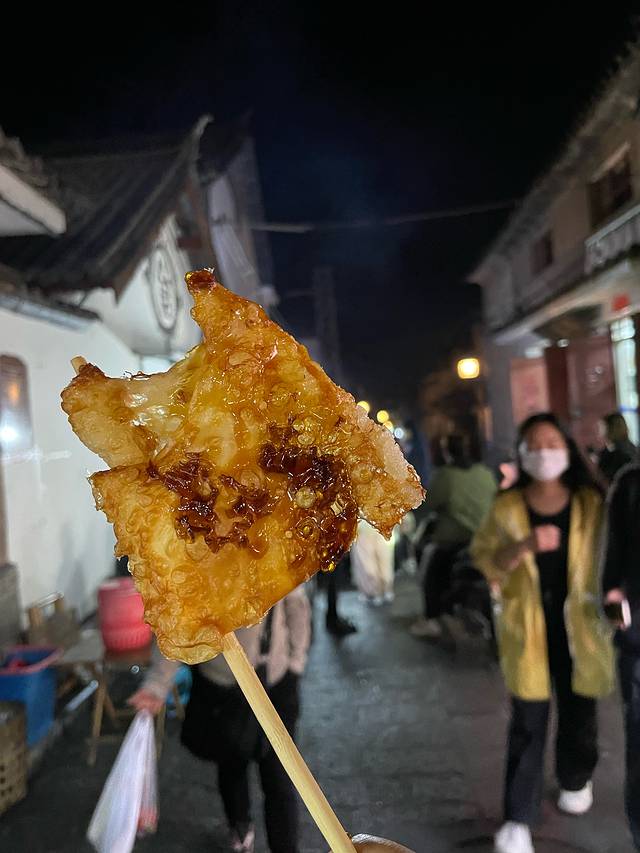 出来逛不就是为了美食么,但因为刚吃完饭,实在吃不动多少,就先感受了一下当地随处可见的烤乳扇。其实儿子在昆明就吃过,说太小记不得了,才买的。主要就是奶酪做的,裹上玫瑰味的甜酱,我感觉我是吃不惯的。