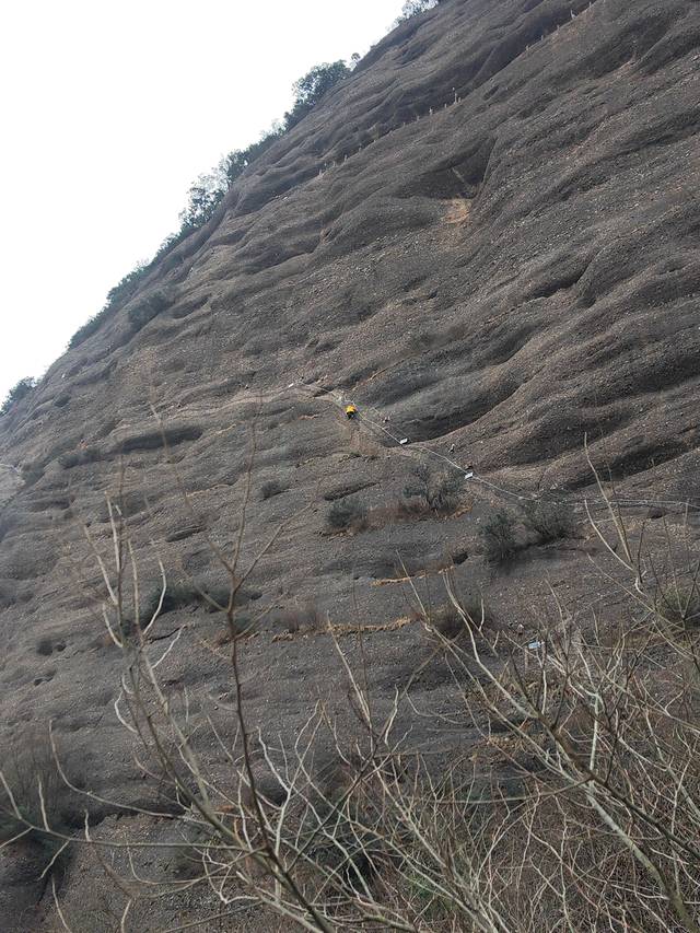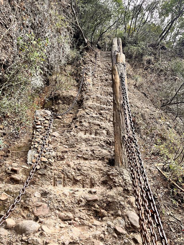 陡峭的鸟道,但这个鸟道并不是太白诗中的“鸟道”。部分地区必须手脚并用,单行道。
