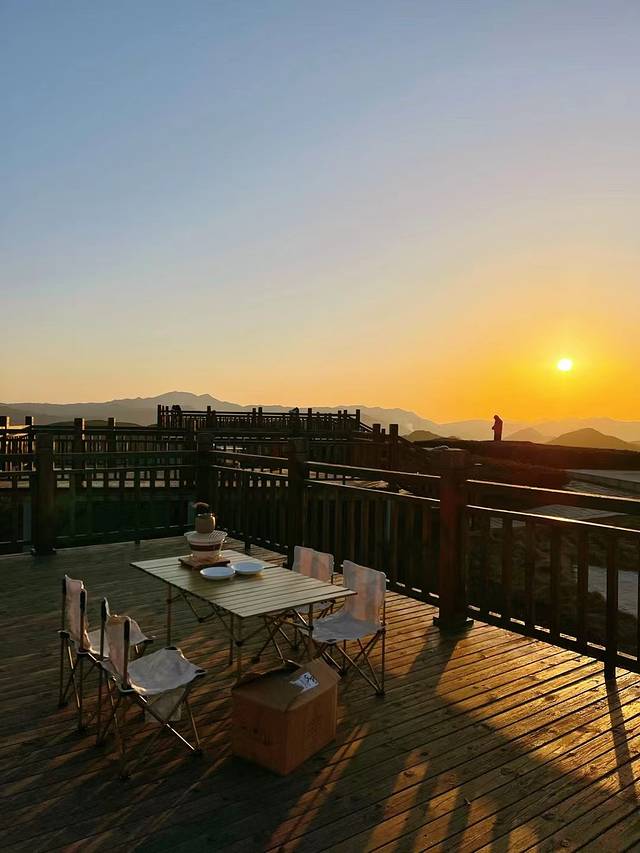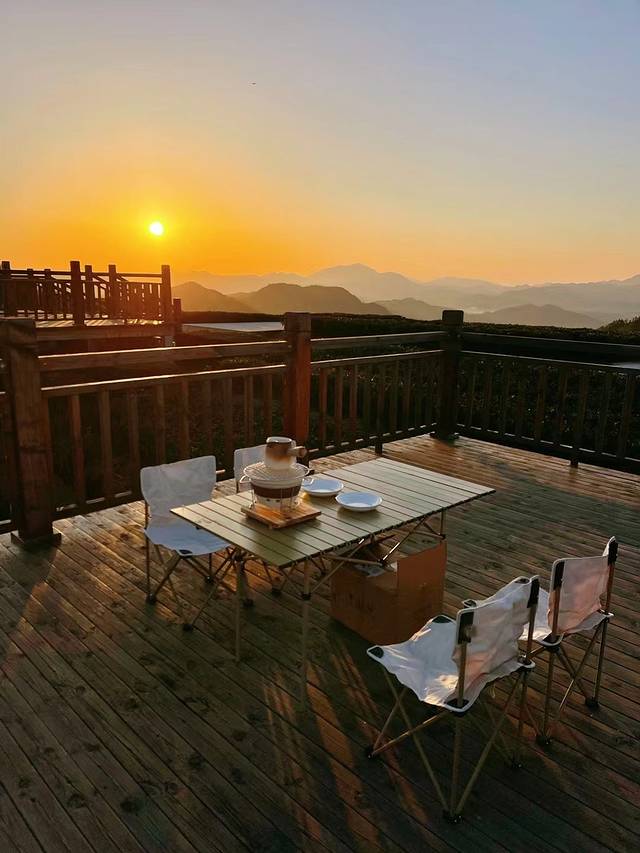 初春的清晨,茶山上温度很低,冻手冻脚的寒冷,但是充满期待的心总是火热的。车子停在茶山脚下,沿着石路上去便是茶山观景台。木质观景台错落在茶山上,当下时尚的围炉煮茶,配上绝美的茶山日出日落,闻着自然宜人的空气,天然的氧吧。于此冥想发呆品茗论道,都是惬意的时光。