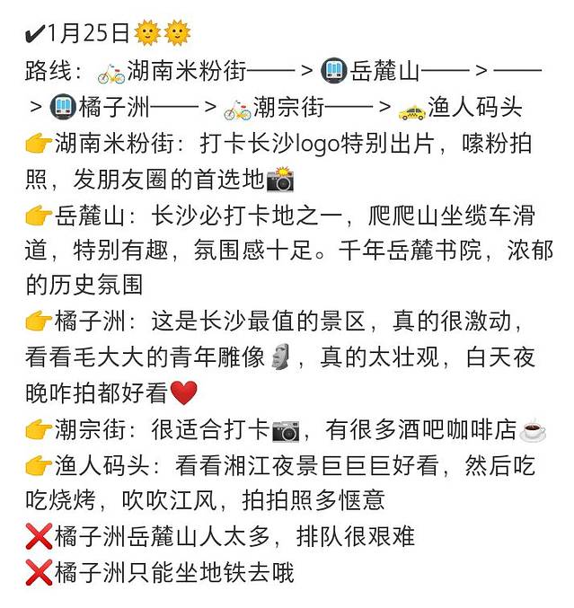 路线:湖南米粉街一>岳麓山一>橘子洲->潮宗街一>渔人码头