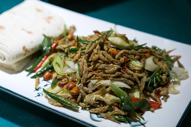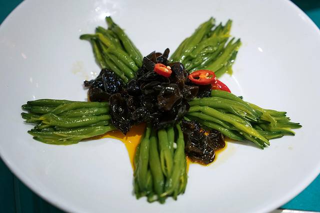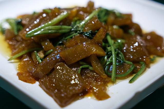 这个也是特色菜,像是我们北方的皮渣,将粉条融化后再加固成型、切片,配着青菜一起炒,别有一番风味。