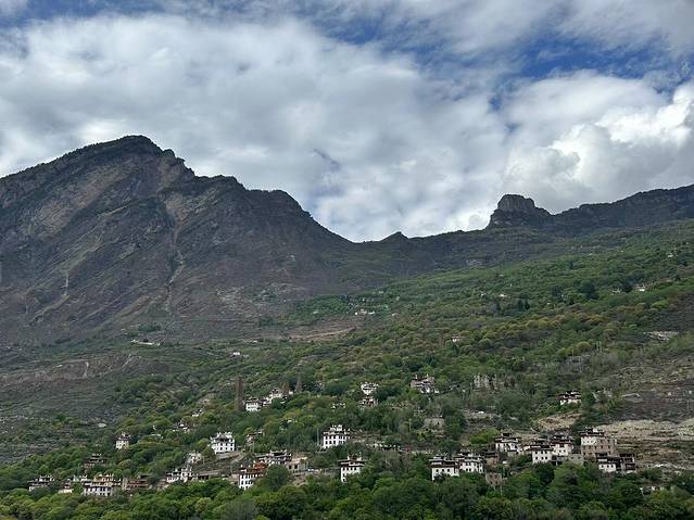 川流过来的河,称为大金河,从小金县流过来的河,叫小金河,还有牦牛沟河在丹巴汇聚为大渡河。甲居藏寨对面是悬崖绝壁,远方是起伏的雪山,嘉絾藏族式民居是用石块垒房,涂成白色,屋檐涂成朱砂色,房屋通为矩形,房顶四个角有似牦牛角的尖尖。按徐江的说法,民居就象小积木堆在绿树浓荫之间,加之尖尖的四个角,很是漂亮,象欧洲的哥特式庄园。中国最美十大乡村,