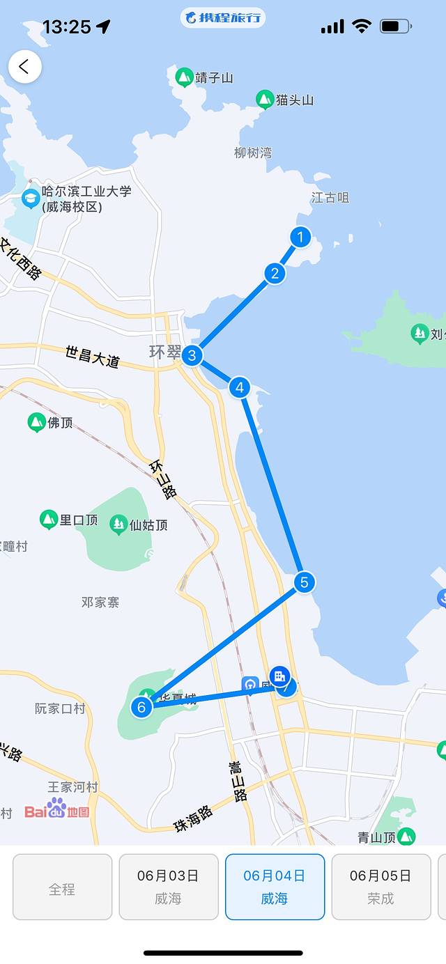 路线:大水泊机场-威海希尔维亚酒店-北方饺子王(海水浴场店)-火炬八街-威海国际海水浴场-环翠区环海路-猫头山-如是海·海鲜烧烤私房菜-威海希尔维亚酒店
