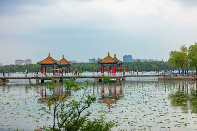 除了湛蓝的湖水,公园的核心景观是四亭桥。夏天,走在阴凉的树影下,漫步公园,享受夏日气息,看被晚霞映满金色的湖水,惬意极了!