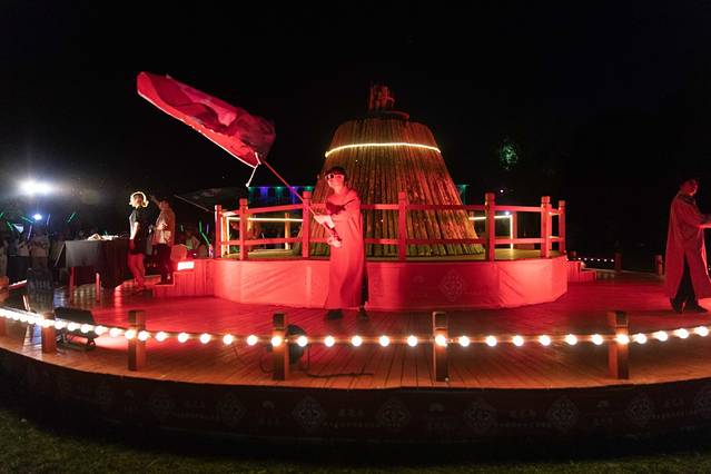火把点燃了,舞蹈也跳起来了,一壶高山流水将演出的氛围推到了高潮。我们朋友也忍不住了,踊跃参与,上台痛饮。