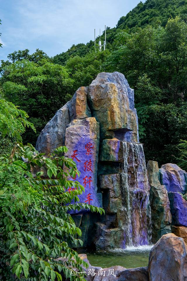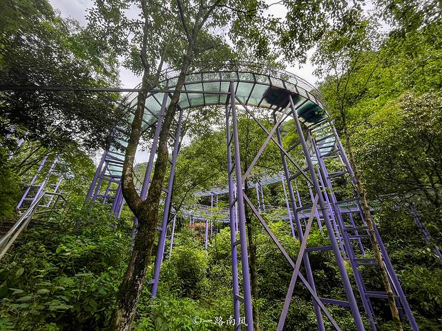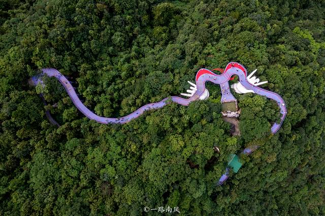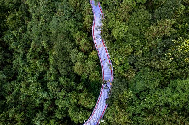 上山后打卡的第一个景点是紫绫纤手,红紫色相间的空中栈道就像一条巨龙在山崖上方飘舞。由森林深处伸出来的两只纤纤玉手,轻轻地托住“紫色的飞龙”,营造出浓郁的禅韵。