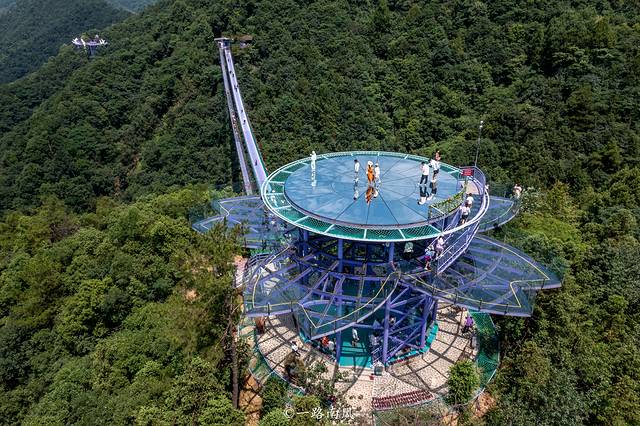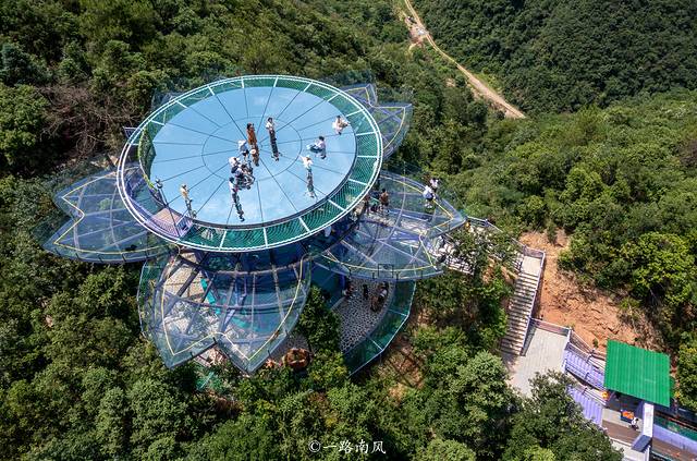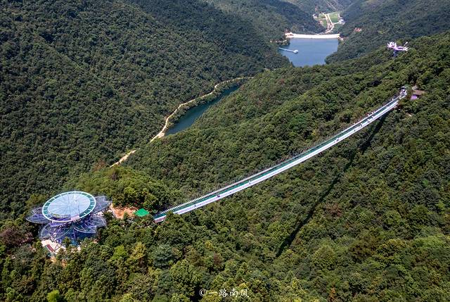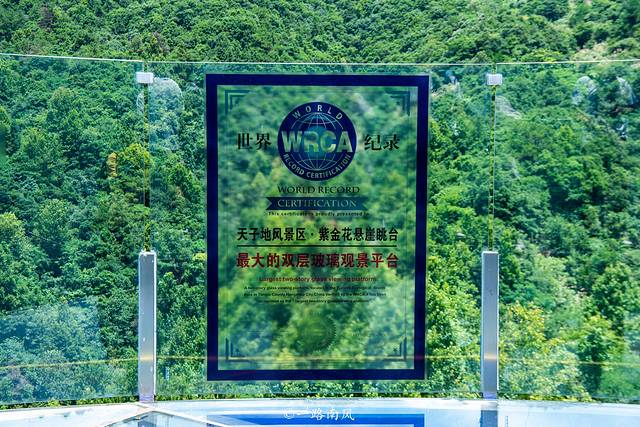 穿过云梯天桥或步步惊心就来到了紫金花悬崖眺台,这是创了世界纪录的世界上最大的双层玻璃观景平台,犹如一朵美丽且巨大的紫金花盛开在大山之间。