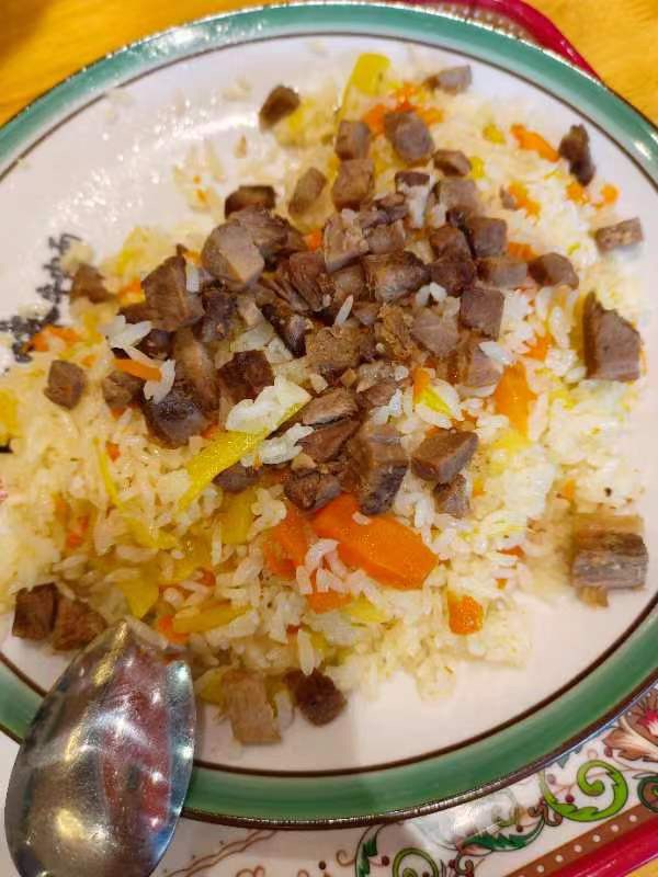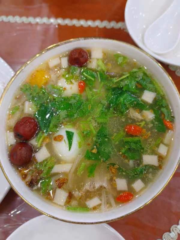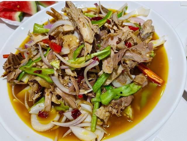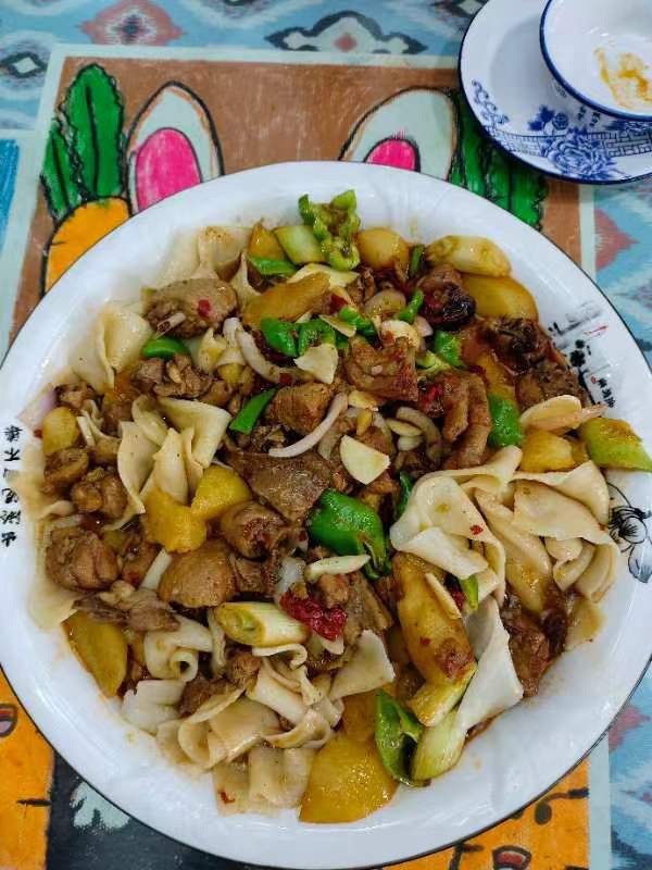 椒麻鸡,78元一份,老板说是一整只鸡,上菜时我们被这份量惊到了。老板家的可爱儿子问我们是不是南方人,上次听南方客人说份量大还是去年的时候。吃不完真的吃不完,我们打包回去,第二天酒店的门卫阿叔很乐意帮我们用微波炉加热。