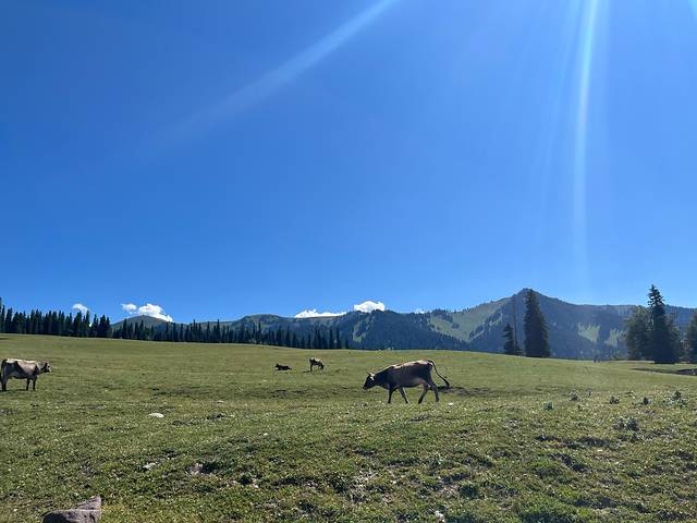 早上八点多从伊宁出发,下午到那拉提草原。那拉提草原由空中草原、河谷草原及那拉提国家森林公园三部分构成,我们时间紧,只去了国家森林公园。建议自驾或自行坐车来,玩的景点多些。