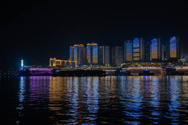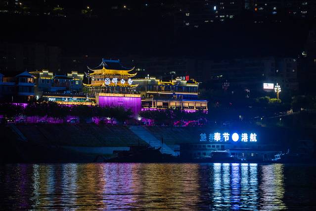 坐上赤甲6号,站至船头或是船尾处,感受夜晚的微风吹拂,所见便是岸上诗城 奉节 那五彩的灯光倒映在江面上,看到了一个流光溢彩的诗城夜景,是那么的惬意与舒适。