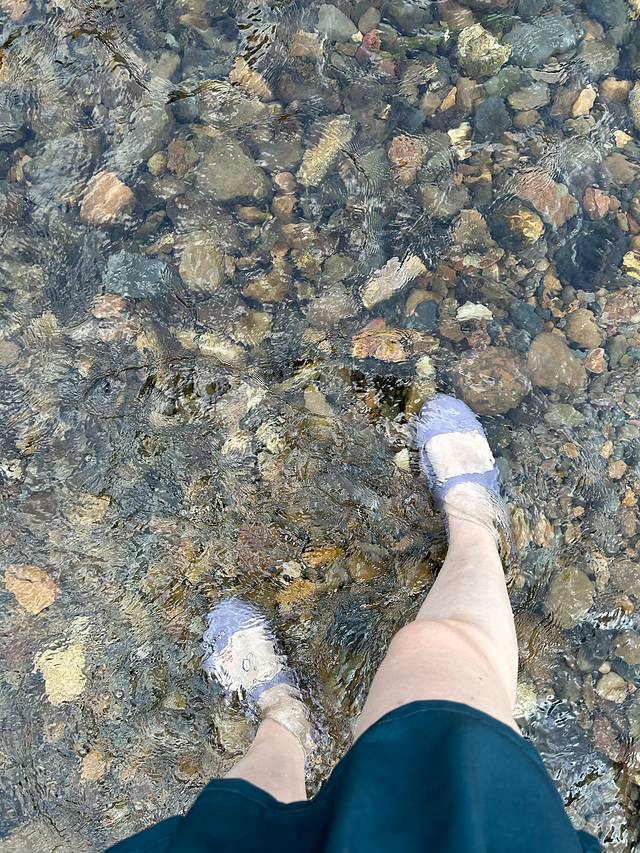 很多人玩水,尝试下水,有点凉,暑假来感觉会更好些。那就玩打水漂吧,河底很多鹅软石。