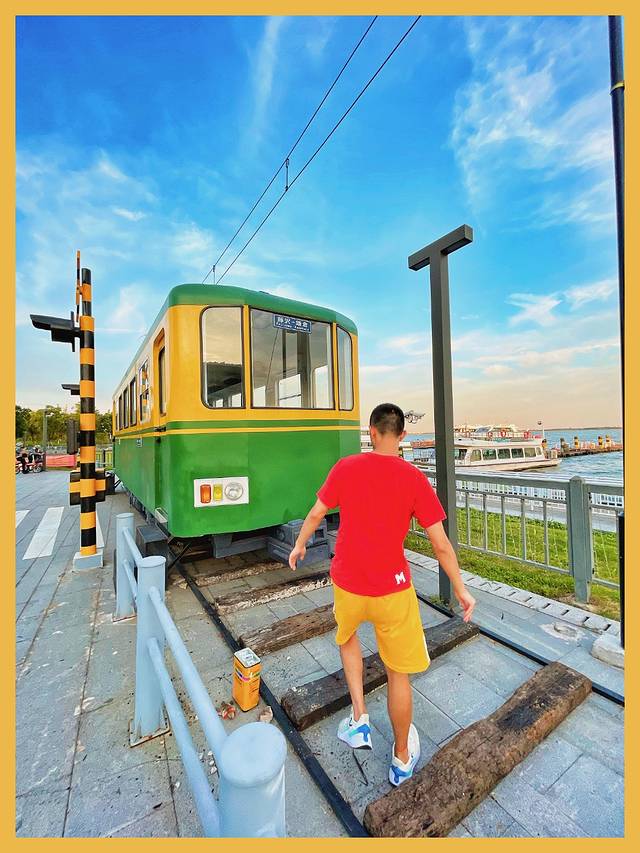 🌊阳光映照在湖水泛起粼粼波光,蓝天做衬一幅绝美画作,加上绿皮火车高饱和度色调搭配橙黄线条勾勒,拍照效果真的绝了。加上轨道、电线、红绿灯🚦,还原度超高,出片率就有点离谱。
