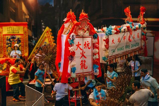 每年中秋前后的三个晚上,是香港大坑社区最热闹的时候。一条“龙”浑身插满点燃的线香,由数百人扛举(其重量超达100公斤,其中单“龙头”就有46公斤,龙头部分需8至10人进行交替接力完成),在热闹的铜锣声中,奋力舞动。“火龙”像是活了一般,香烟四溢,穿行于大街小巷。