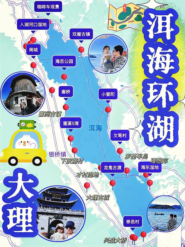 双廊古镇—鹿卧山—挖色—小普陀—文笔村—罗荃半岛—理想邦—南村—海东湿地—洱海公园—兴盛大桥。