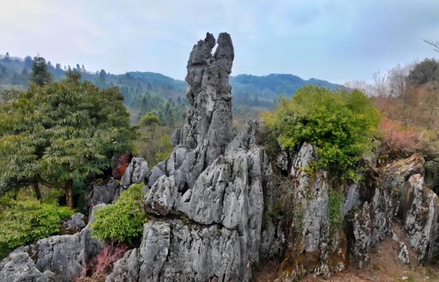 华蓥山的山石形态各异,矗立在山巅,仿佛是亿万年前的石头在默默讲述着岁月的故事。其中,我特别喜欢那些群石。它们像是一群顽皮的孩子,在山间嬉戏。道路曲折蜿蜒,让人在探索中不断发现新的惊喜。有的石头像一个思考者,独自守望着这片天地,仿佛在沉思着无尽的哲学问题。而有的石头则像英雄的魂魄,挺立在山巅,眺望着远方,似乎在盼望着革命胜利的曙光。