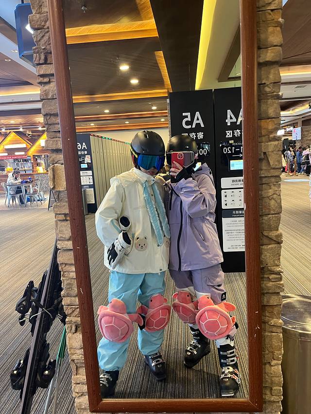 第二天早上起来拿上提前租好的雪服护具手套准备去滑雪,万达的雪道太多了,对于初学者的我们只能先去魔毯练练手了。