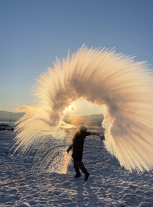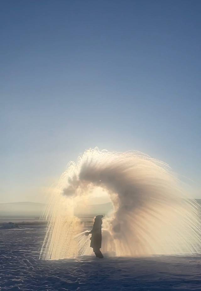 早上8点烧了热水,准备去泼水成冰,真的,这样美丽的景象一辈子一定要体验一回,拍出来太美了,热水与低温的碰撞,加之初生的太阳才会勾勒出如此美妙的画面。