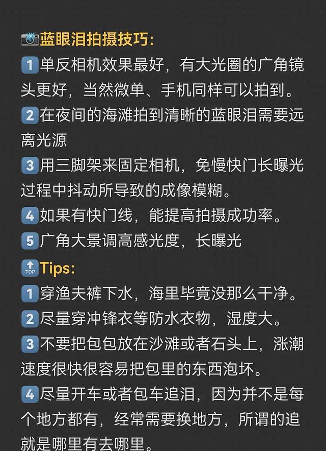 <减少外界光源对于观赏“蓝眼泪”的影响。不要打光,不要开手电,拍照不要开闪光灯。虽然“蓝眼泪”需要海水搅动才会出现,