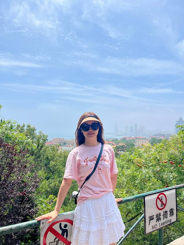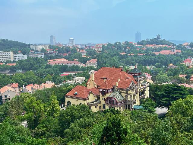 十分钟就能爬到山顶,从山顶可以看到青岛的红瓦白墙,蓝天碧海。小朋友也很配合,一口气冲顶。