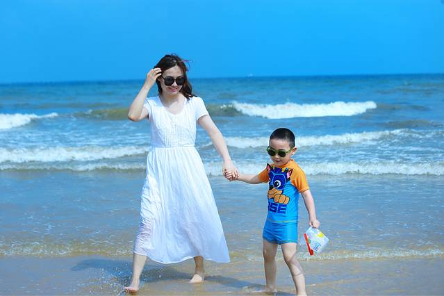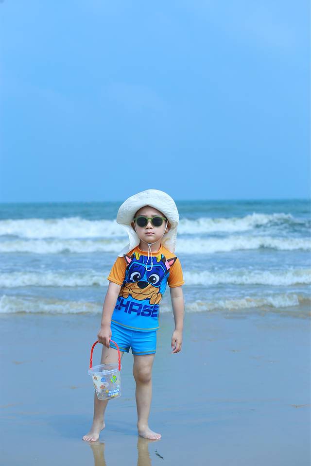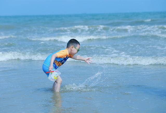 第一站日照第三海水浴场,小锦鲤人小胆子也小,去的路上就在三跟我强调,妈妈我还小,我不游泳,我说不游,他追问那为什么带泳衣,我说为了海边玩啊。到了海边,就远远的挖沙子,接触海还是因为要用桶去舀水,然后一发不可收拾的靠近再靠近,最后直接在海水边儿奔跑不想出来。刚下水没多久,就绊倒在海里,衣服全湿了,好吧,那就上泳衣,穿上泳衣后自由了很多,更加疯狂的在海边试探,也越来越兴奋。
