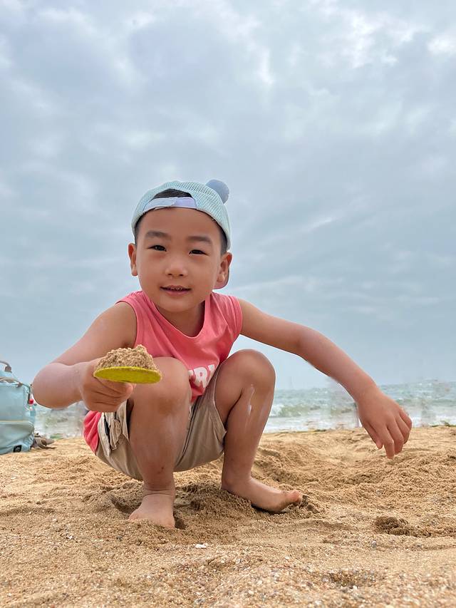 今天是阴天,海风都把小朋友的鼻涕都吹出来了。但丝毫不影响小朋友的挖沙行动。