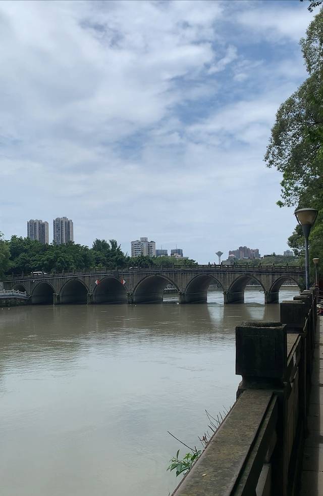 👉从公园的南门出去就到达了新九眼桥,因为老的九眼桥妨碍泄洪,因此已经被拆除了,但是为了给人民留下一个纪念,在此新建了新的九眼桥。模仿曾经的九孔石拱桥的形式而建成,旧的已经不复存在,因此只能看见这个新的九眼桥,望江公园内可以看到。