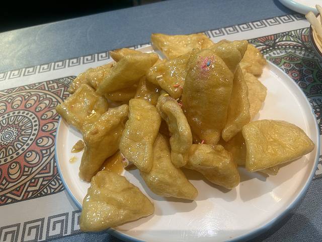 酥黄菜,蛋皮炸的 裹甜汁儿 吃着有点儿萨其马的感觉,好像是东北特色菜 不是每个店都做,看到他家有就点来尝尝,属于尝鲜 不会点第二次的类型(有点像甜品)