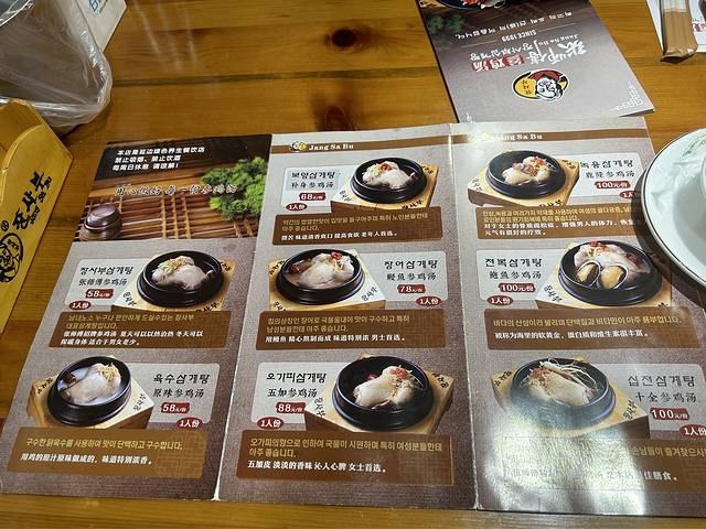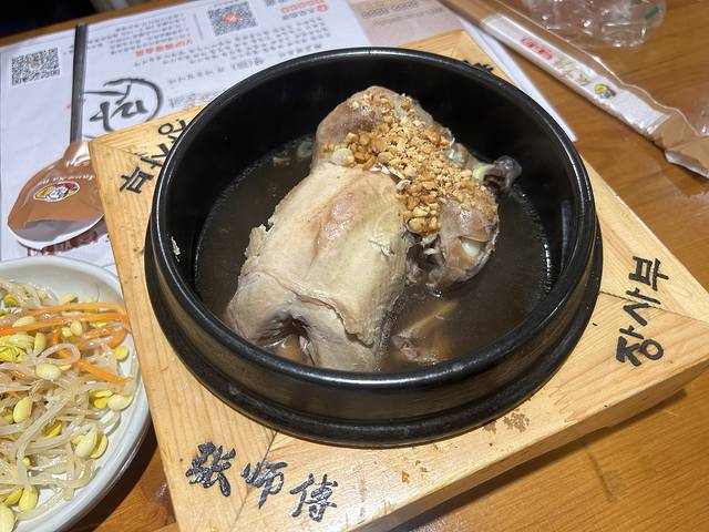 鸡肉炖的很软烂,可以给服务员说加汤,感觉汤是精华,能喝到淡淡参的味道,如果不加汤 他本来给的汤很少。鸡肉没有味道,需要蘸给的酱油料(微咸)。参鸡汤里面包的糯米饭。