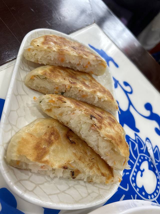 萝卜丝饼 两个起点。里面的白萝卜丝馅儿没有怎么调味就是原味 比较清淡,稍微掺了点儿胡萝卜 丝擦的很细,外面的饼皮酥脆,他家的油饼好像比较有名 但我们这次没点,这个萝卜丝饼外皮感觉可能跟油饼皮也比较类似。