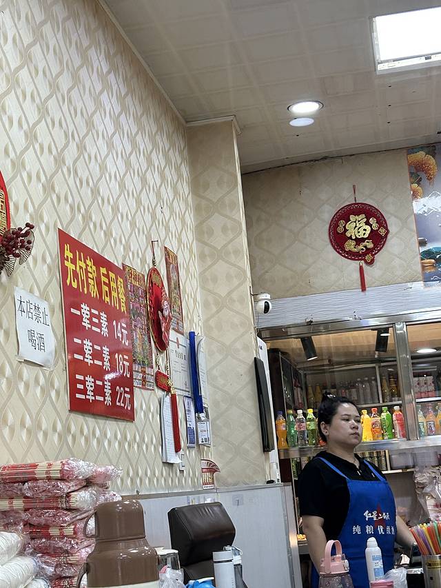 没什么服务,找好桌子,看墙上菜单点菜,选好菜和服务员报桌号儿和菜就可以等上菜了。