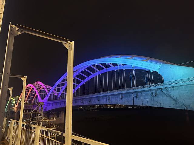 第一天住在了东升江畔,临松花江大桥,位置很好,桥下沿江有夜市,但没什么特色,桥上八点半多亮的灯,亮灯后更好看些。