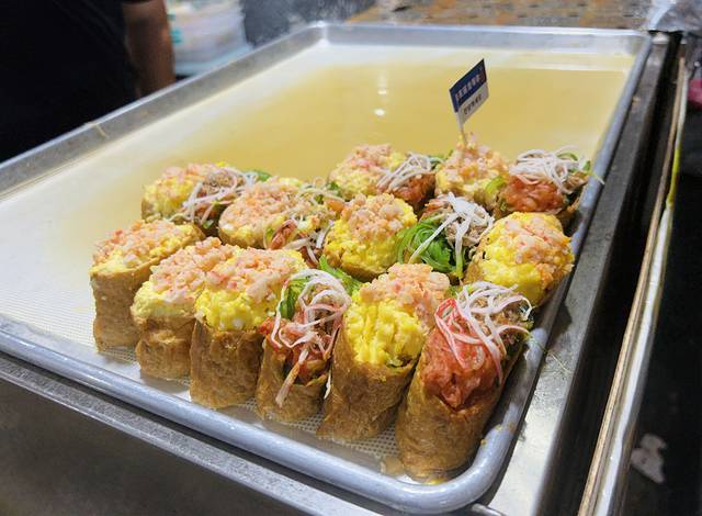 好像本来15/个,去的时候快收摊了 20俩。说是韩国小吃,腐皮里面包的糯米 上面是金枪鱼蟹棒丝和一点泡菜,腐皮比较甜 味道还可以去像腐皮饭包(要说特色大概就是整个市场就一家/好像是)