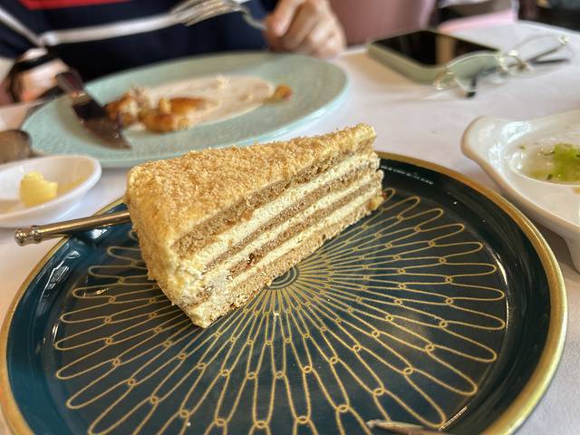 等鱼等太久 送了一份俄罗斯蛋糕 吃起来是咸甜口 不是想象中的齁甜,蛋糕体比戚风扎实 磅蛋糕或布朗尼的口感。