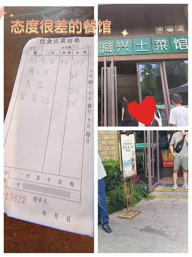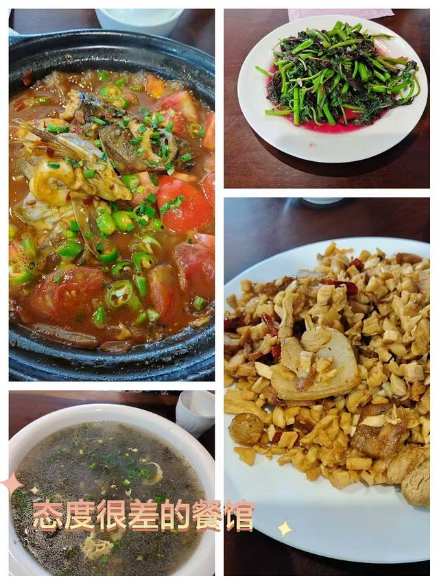 吃饭:早上在酒店对面一家店吃了米粉。中午在兴坪码头的一家店(漓兴土菜馆,另一个名字是漓江又一轩)吃的,也是几天中体验感最差的。店比较大,做的就是各个旅行团的生意,估计都是跟导游有合作。因为我们的团不包食宿,所以有的人没有吃饭。我们虽然不饿,但因为有小孩老人,还是去吃饭了。点了阳朔啤酒鱼,用的是他们推荐的剑骨鱼(我感觉很像我们吃的胡子鲶,但后来问当地其他人,说不是的),然后是腊肉炒萝卜干、红苋菜和紫菜蛋汤,菜的味道一般,尤其是腊肉炒萝卜干,菜一上桌我就后悔了。总共花费249元。结账的时候,才知道要收4元一位的茶水费饭费等(后面发现当地都是这样的),问了一声,结账的前台就脾气很冲的来了一句:“你们进来就跟你们说了,何必做出这么吃惊的样子。”实际上根本没人跟我们说,菜单上也许有写但我们没注意。其实我也不是真的要抱怨什么,就是觉得他们的服务米饭不值那个价,没想到啥都没说她就这样子。我一下就火了,大声问她:“难道问一下都不行吗?你怎么这个态度?”然后对方接着一副爱答不理的样子说“我就这样,4块钱一位又不是没跟你们说,我们都是明码标价,何必故意装出那副样子”“你要投诉就去投诉,随便你”,摆明了就是因为吃饭的都是游客,不会来第二次,所以爱咋滴咋滴的态度,气的我半死,整个心情都被破坏。