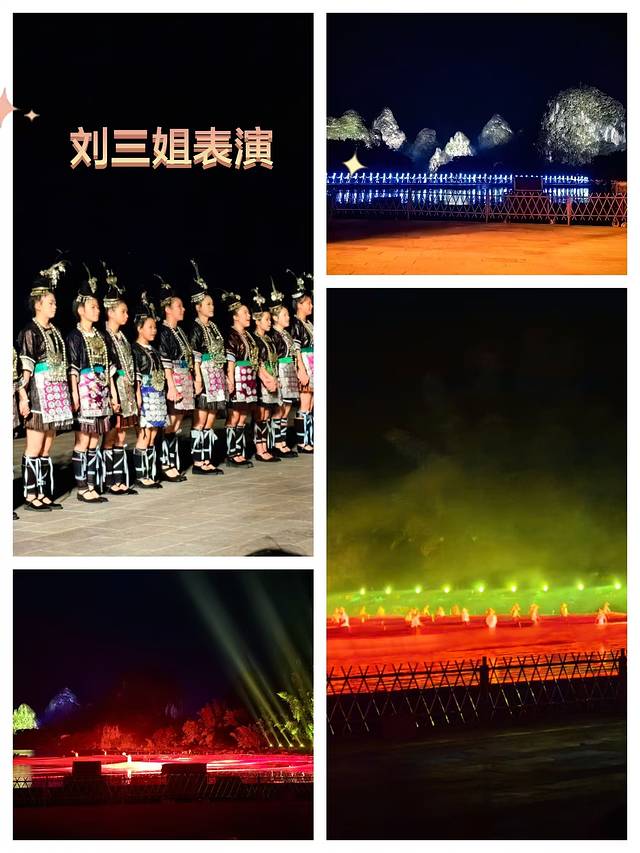 因为提前到了,又联系旅行社的人帮忙改了晚上看刘三姐的场次,改到了第一场8点钟开始的。整个演出1个小时,观众都坐满了。表演的舞台主要是在水上,场面很有张艺谋特色,虽然是二十年前的作品,但舞美效果还是很好的,但感觉内容比较空洞,因为表演者离观众很远,也看不太清。整体评价一般。旅行社定的票座位很靠前,在第二排。这里觉得略微坑爹的是,儿童票虽然有优惠,但是是没有固定座位的,入场的时候找工作人员领一个折叠凳,然后观看的时候将折叠凳放在前后两排座位中间。