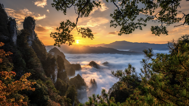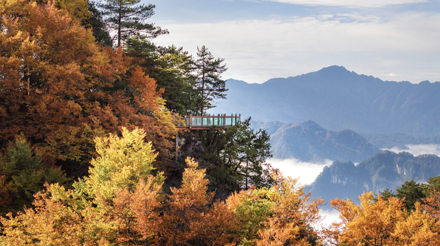 传说七个仙女下凡后化作的七女峰,同样常年被薄雾笼罩,观景台上视野开阔,可以将云雾缠绕山腰、红叶妆点山体的场景尽收眼底。